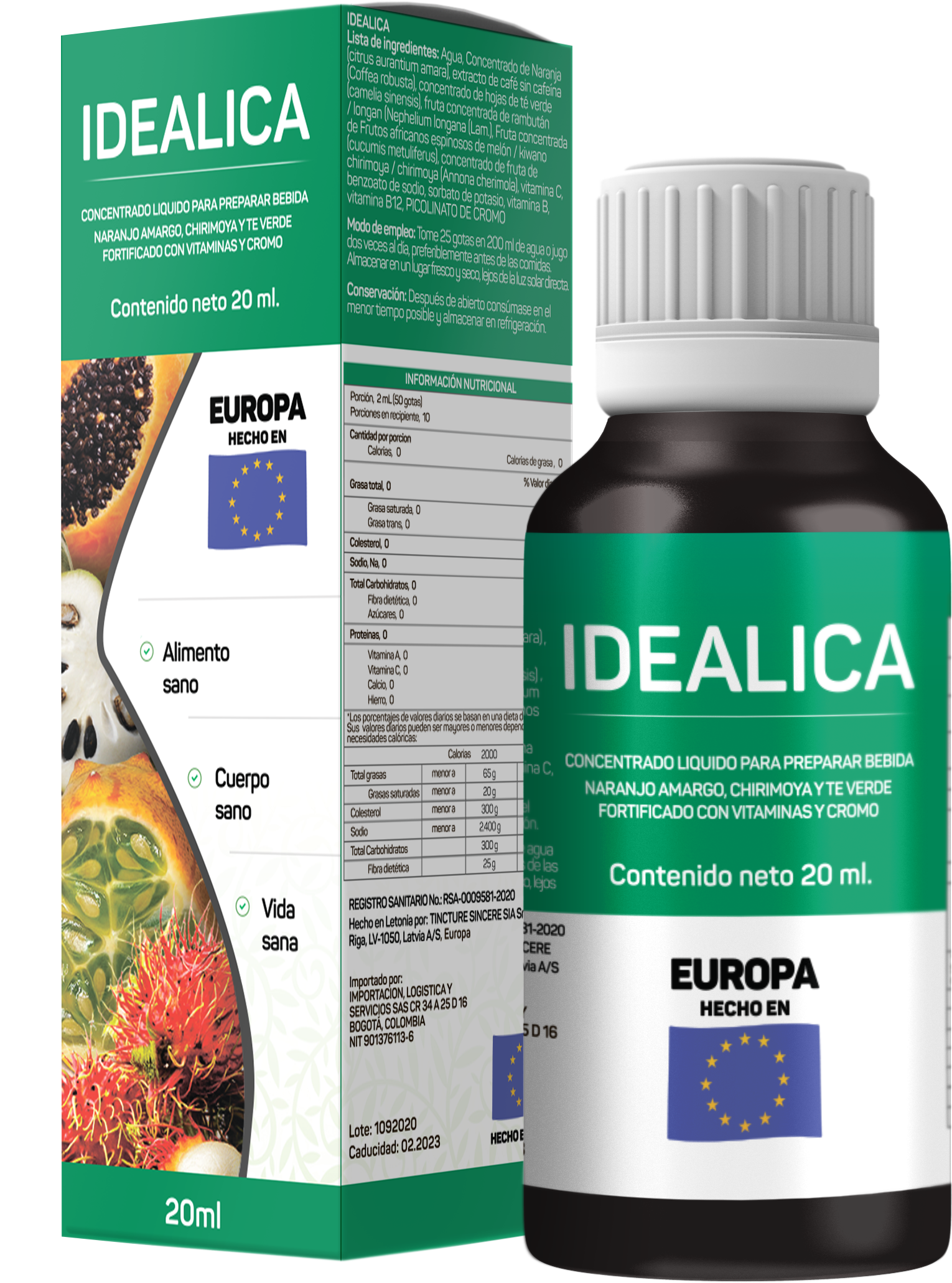 Idealica son unas gotas naturales. ¡Una porción (25 gotas) contiene extractos de hierbas especiales que aumentan 10 veces la velocidad de quema de grasa! Se ha demostrado clínicamente que Idealica acelera el metabolismo, restaura el sistema endocrino, estimula la regeneración tisular y suprime la sensación de hambre. El producto es completamente natural y es un estimulador activo de procesos naturales en el cuerpo humano. Debido a que la quema de masa grasa se produce a través de un metabolismo rápido, no se requiere una dieta estricta. Una dieta equilibrada es suficiente para mantener el metabolismo. El esfuerzo físico intenso en este caso no es necesario. En caso de apuro, una simple carga es suficiente.